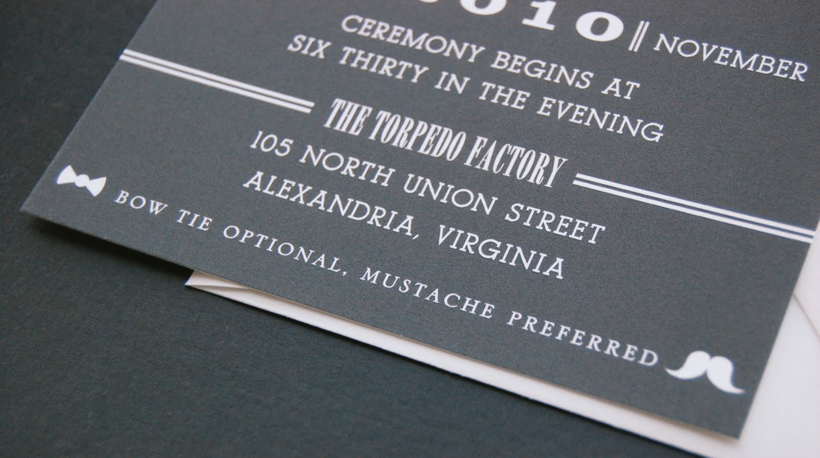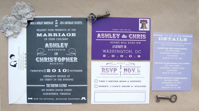 Ashley and Chris are kind of weird and I love it! They have a great sense of humor and a really laid back approach to their wedding. When we discussed their invites they were open to any ideas but the only thing that needed to make the cut was “Bow Tie Optional, Mustache Preferred.” That pretty much sets the tone for these two. We kept it very text heavy with different shades of purple and charcoal. Chris wanted to make sure there was some plaid involved so a custom pattern was created for the belly band to tie it all together. Their venue is very cool and modern and they wanted their invites to reflect that. We did a postcard for the reply card instead of the classic envelope. The return address image was created from the photo they used for their save the dates. These are a great reflection of Ashley and Chris as a couple, which is what it’s all about. A & C, keep us posted on how many people show up with fresh ‘staches!